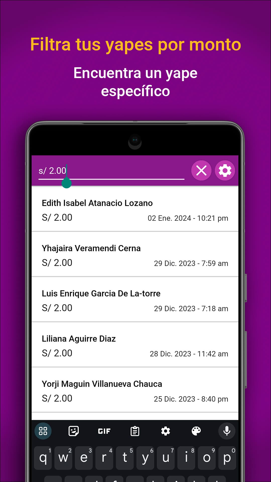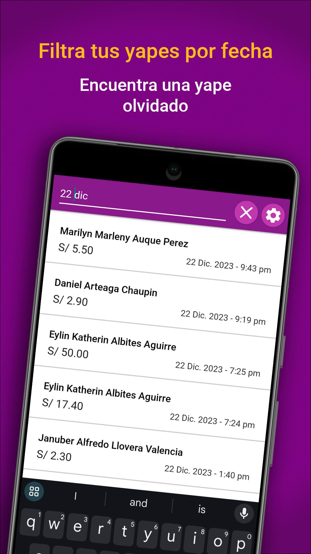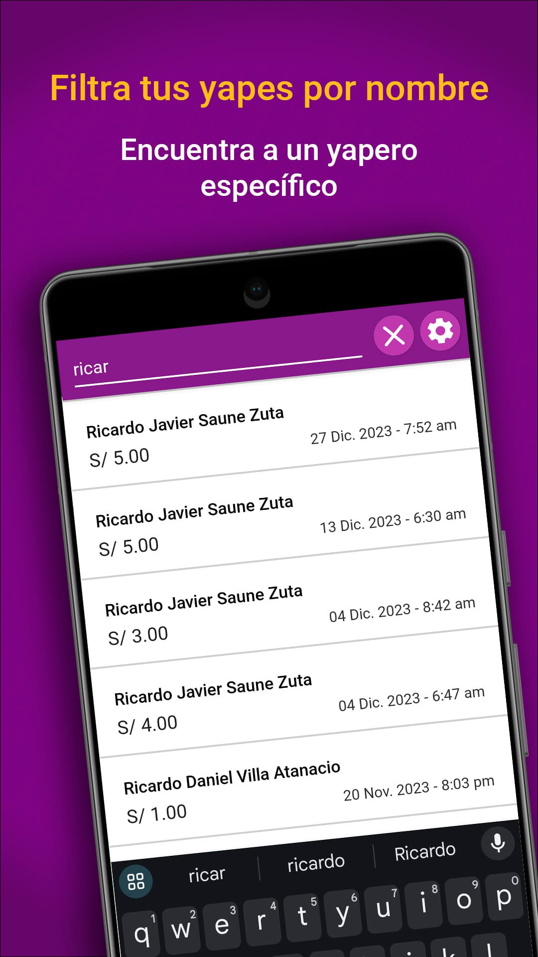 - Permite hacer filtrado por nombre, fecha o monto para encontrar un Yape