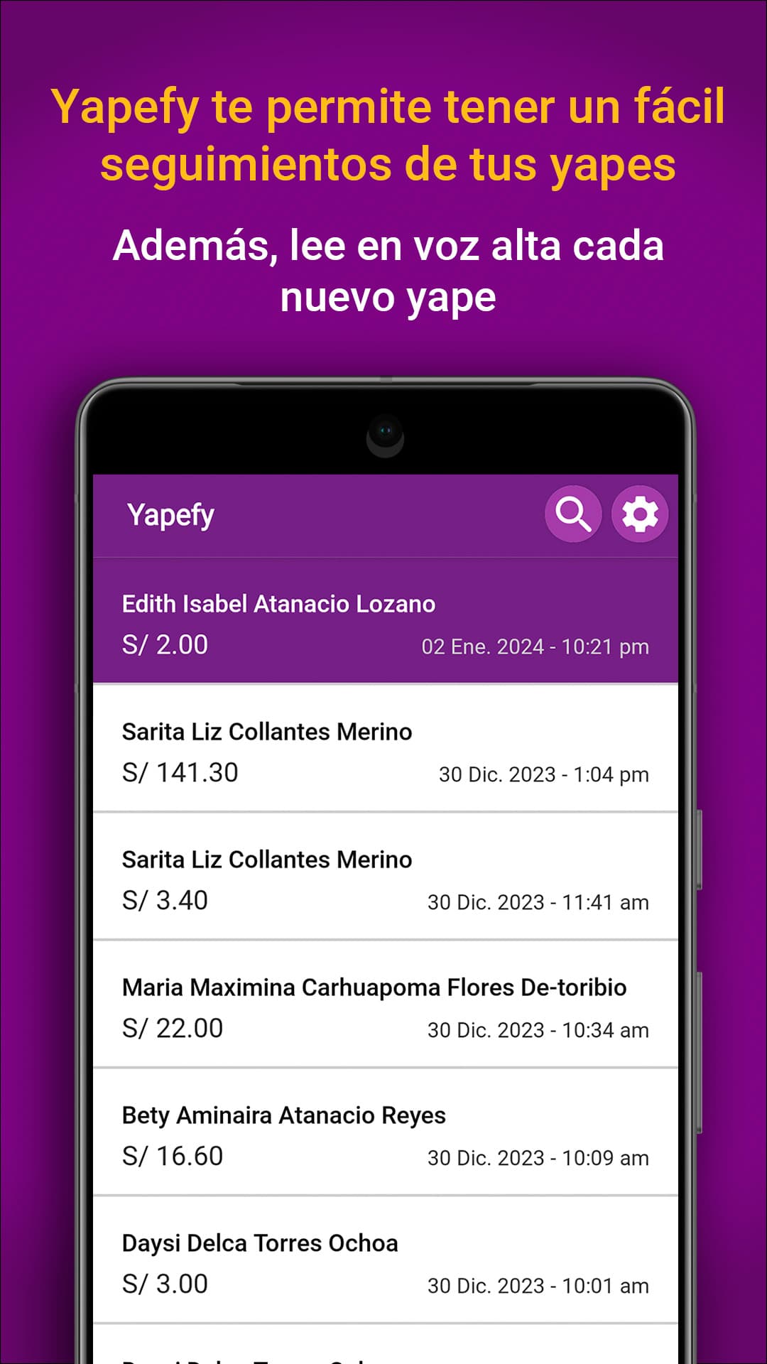 Yapefy da lectura en voz alta a las notificaciones de tus nuevos yapes, además te permite hacer filtrado de tus pagos por nombre, fecha o monto para encontrar un Yape pasado.